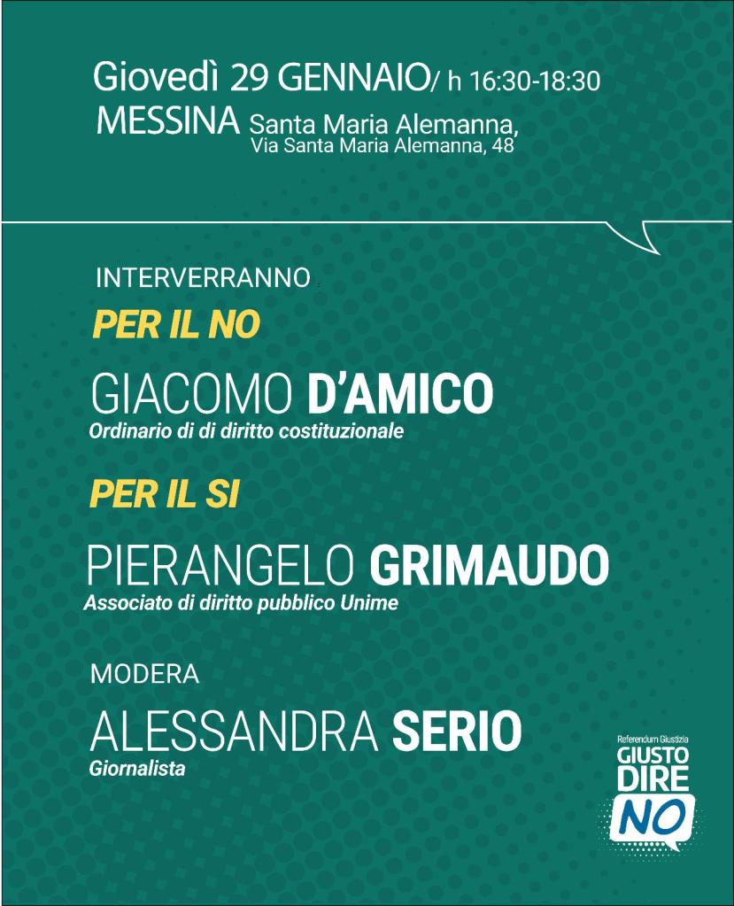 Anche a Messina si anima il dibattito sul referendum confermativo della riforma Nordio. Il Comitato Giusto dire no organizza un nuovo incontro pubblico con relatori di alto profilo per approfondire tutti i temi legati alla separazione delle carriere e il “nuovo”Csm.