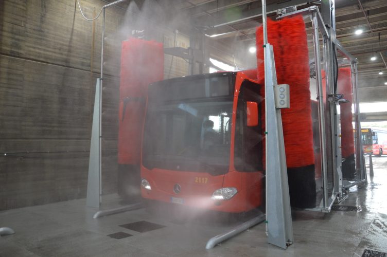 Un bus viene lavato e asciugato in cinque minuti
