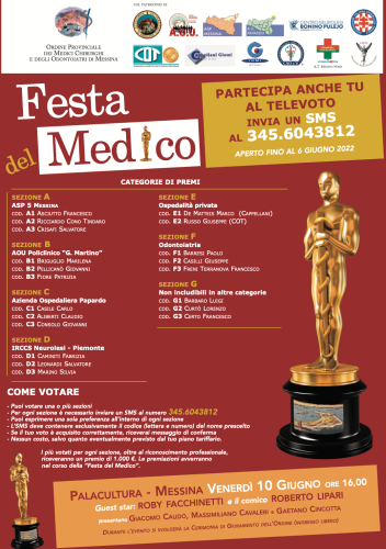 Della giuria fanno parte: Giovanni Frazzica, in rappresentanza del Tribunale per i Diritti del Malato, quale Coordinatore dell’Assemblea Territoriale Messina Nord; Giacomo Nicocia, in rappresentanza dell’Aou Policlinico “G. Martino”; Domenico Sindoni (ASP Messina); Maria Felicita Crupi (Irccs Centro Neurolesi Piemonte); Giuseppe Ranieri Trimarchi (Papardo); Domenico Chiera (Cot); Daniele Sinardi (Cappellani – Giomi; Rosanna Casella (Iomi); Luca Valerio Radicati (Aiop Messina) e Giuseppe Renzo (presidente Commissione odontoiatri). In occasione della Festa del Medico saranno assegnati alcuni riconoscimenti speciali: la targa dell’Ordine al medico scrittore Alfredo Buttafarro, che sarà consegnata dal vicepresidente dell’Associazione medici scrittori italiani Giuseppe Ruggeri; premio all’Ospedale militare nella persona del direttore Alfonso Zizza per l’impegno profuso sul fronte dell’emergenza covid e premi alla carriera all’odontoiatra Bruno Militie al dottore Filippo Zagami.
