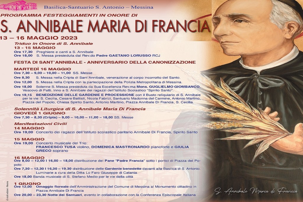 La Comunità della Basilica di S. Antonio, in occasione dei solenni festeggiamenti del Padre Fondatore S. Annibale Maria Di Francia, inviterà la comunità messinese a rendere lode al Signore per il dono della Santità concessa a Padre Annibale e a pregare perché infonda pace e serenità nelle nostre famiglie e nel mondo, ed in particolare all’Ucraina e al Sudan.
