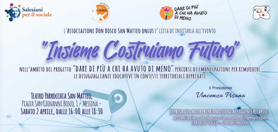 MESSINA – L’associazione Don Bosco San Matteo Onlus, organizza l’evento “Insieme costruiamo futuro”, nell’ambito del progetto “Dare di più a chi ha avuto di meno – Percorsi di emancipazione per rimuovere le disuguaglianze educative in contesti territoriali deprivati”.