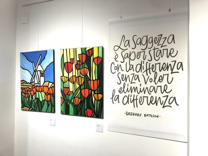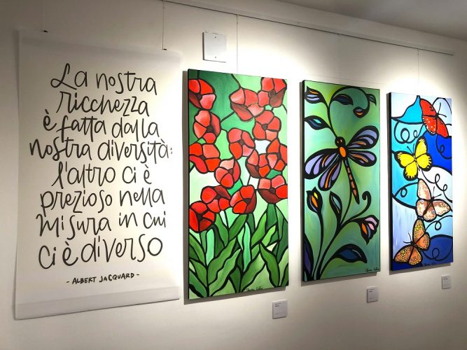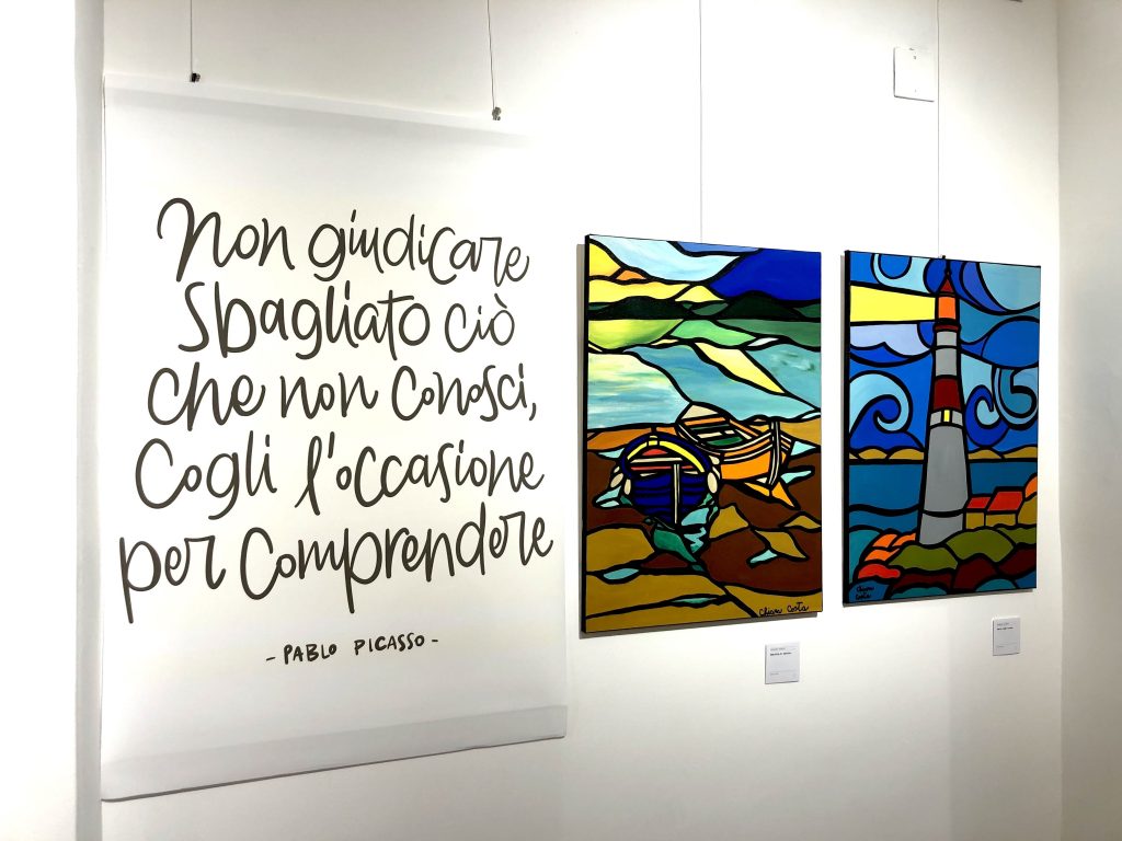 Nell’allestimento della sala, si è pensato a posizionare, oltre alle 25 opere, dei testi sulle pareti che potessero aiutare il visitatore a comprendere il concetto di disabilità. Tre i messaggi non invadenti, quelli di Pablo Picasso, Gregory Bateson e di Albert Jacquard che fanno riflettere su cosa è la disabilità cognitiva.