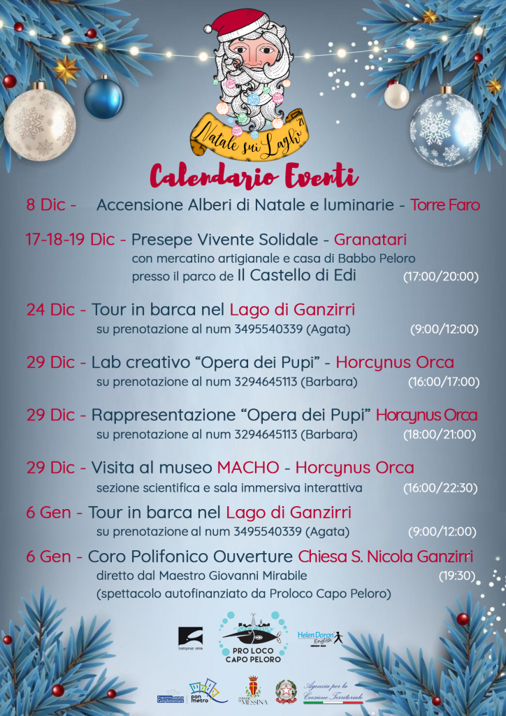 La Pro Loco Capo Peloro – associazione no profit che, da anni, opera sul territorio puntando alla piena condivisione con la comunità della Riserva Naturale – propone una serie di eventi che hanno preso già il via lo scorso 8 dicembre con l’accensione degli alberi di Natale e delle luminarie lungo le strade dei borghi.