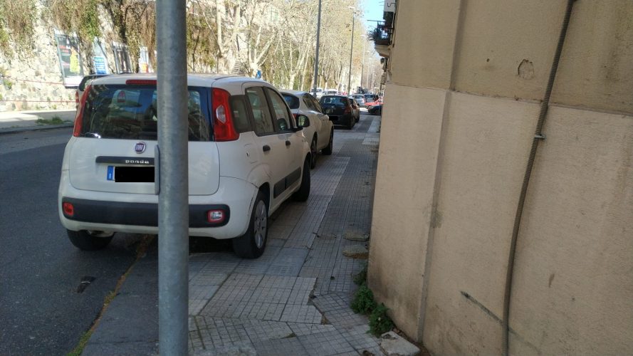 Ma avevamo suggerito che, come avviene per la parte a valle per i parcheggi della Questura, era utile posizionare i dissuasori a metà del marciapiede, in modo tale da consentire almeno il parcheggio in parallelo alla strada e, contemporaneamente, lasciare libero il passaggio per i pedoni.