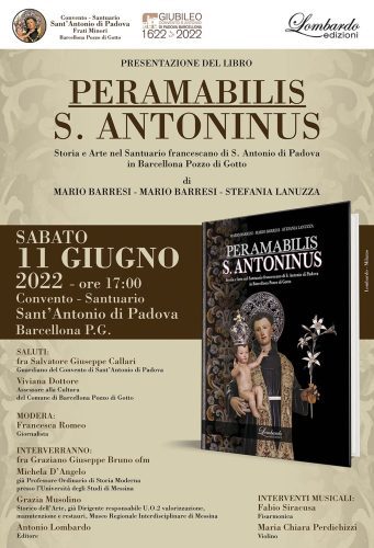 Sabato 11 giugno 2022, invece, alle ore 17, presso il Santuario Sant’Antonio di Padova in Barcellona Pozzo di Gotto si terrà la presentazione del libro “Peramabilis S. Antoninus. Storia e Arte nel Santuario