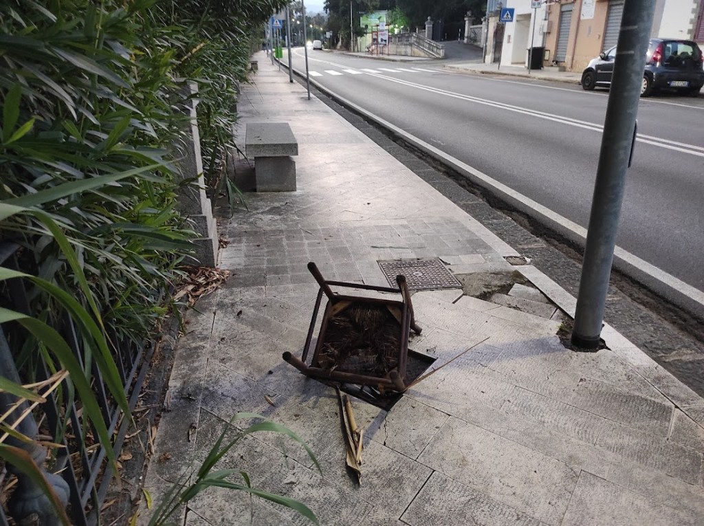 L’avevamo segnalato qualche mese fa e la situazione non è cambiata. A poca distanza, altri residui di panchine e poi un tombino rotto, segnalato da una vecchia sedia piazzata lì per non farci finire qualcuno dentro.