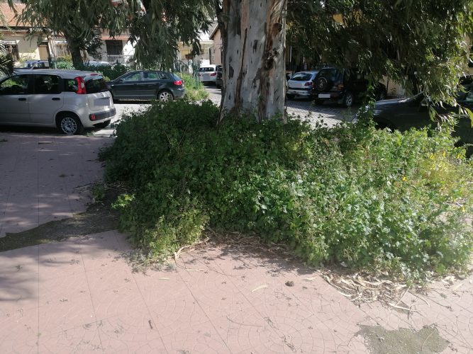Allega anche le immagini della Piazzetta di Ritiro, sottostante la Caserma dei Carabinieri a Giostra, spiegando come le immagini “testimoniano la Piazzetta ridotta ad una giungla, con pavimentazione dissestata in più punti”.