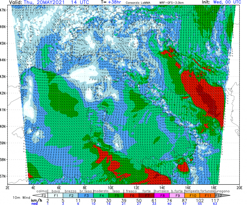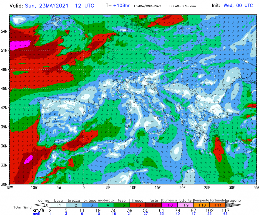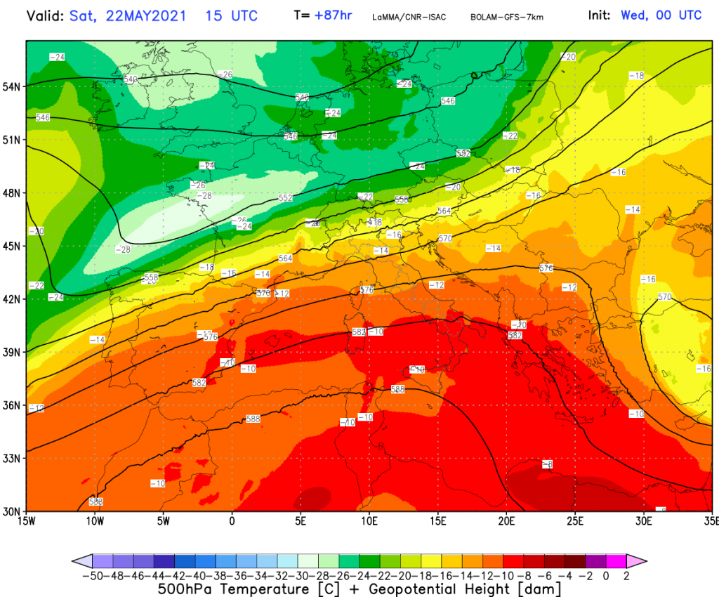 Nel weekend un promontorio di alta pressione, in risalita dal nord Africa, contribuirà a far alzare ulteriormente la pressione atmosferica, provocando una maggiore stabilizzazione della colonna d’aria. In realtà non si tratterà dell’anticiclone africano, ma di una costola dell’azzorriano, che sotto la spinta della corrente a getto subtropicale risalirà fino al bacino centrale del Mediterraneo, attraverso i deserti del Maghreb, pompando aria calda subtropicale continentale (calda e secca in quota) fino alle nostre regioni. Ciò significherà bel tempo, tempo stabile e soleggiato, con temperature massime in aumento a partire da domenica 23 maggio. I venti si disporranno dai quadranti meridionali al suolo, con l’ostro che dallo Ionio si propagherà fino allo Stretto di Messina, spirando fra il debole e il moderato.