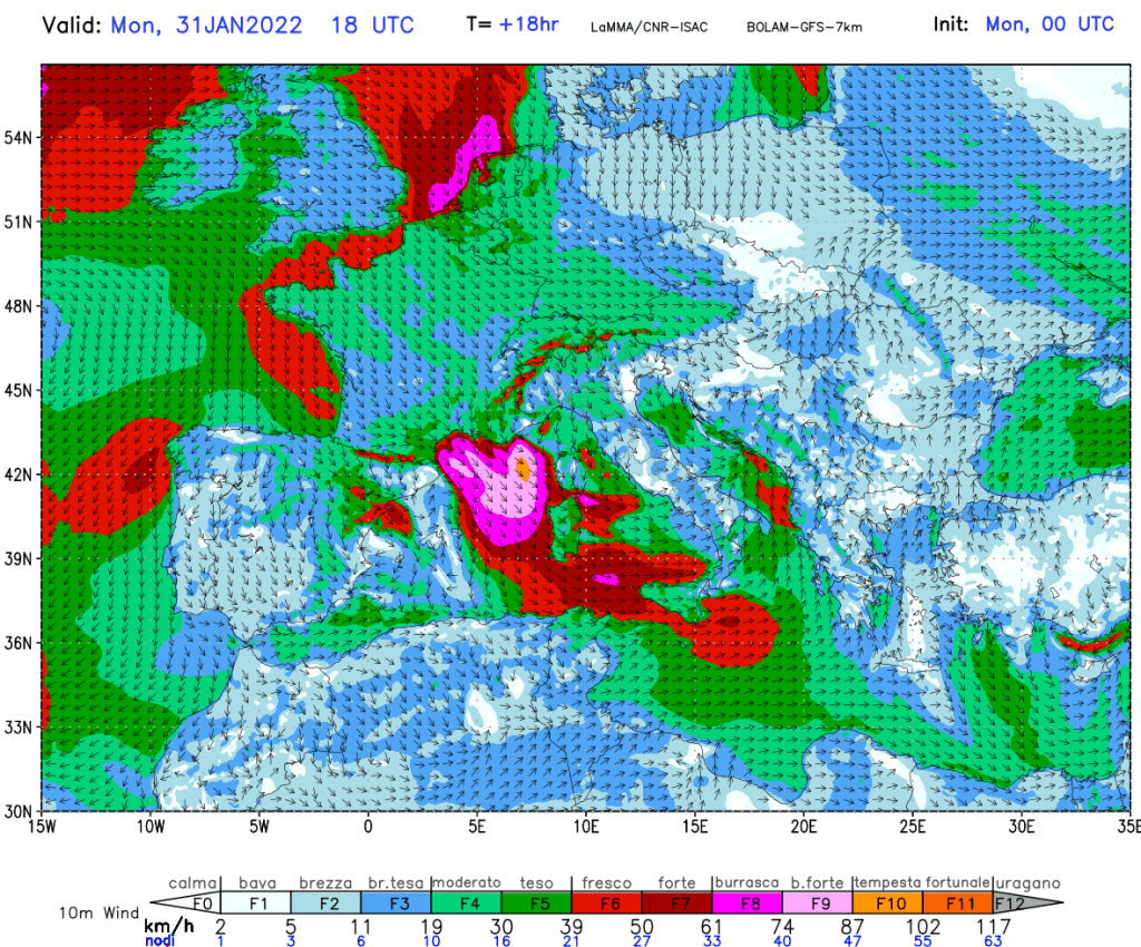 Queste precipitazioni, passato il fronte, saranno accompagnate dall’irrompere delle intense raffiche di vento, da NW, con picchi fino a più di 60-70 km/h, capaci di rendere le precipitazioni semi/orizzontali. Mentre sul Tirreno, già in mattinata, spireranno intensi venti da N-NW e Nord che raggiungeranno forza 6/7 Beaufort. Anche se già verso l’orario centrale del giorno e il primo pomeriggio il tempo andrà a migliorare, con schiarite sempre più ampie, accompagnate dalla tramontana, l’ingresso di aria più fredda da Nord, sopra le più miti acque del Tirreno, potrà produrre ancora dell’instabilità.