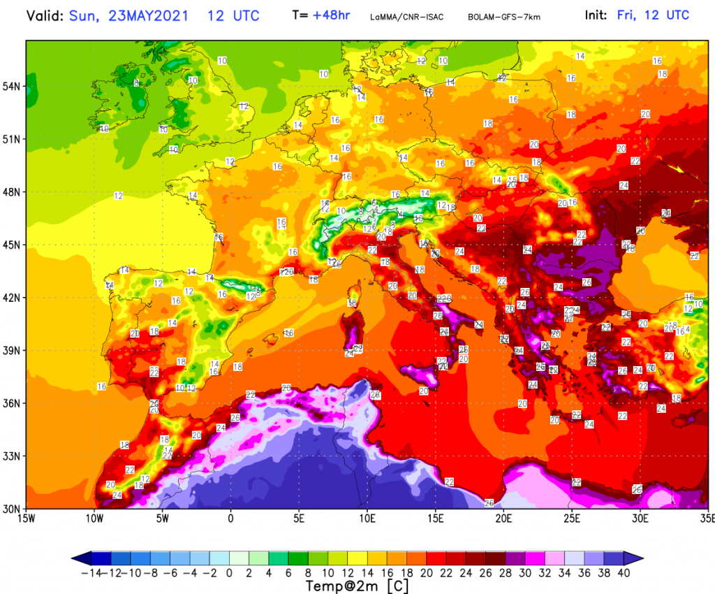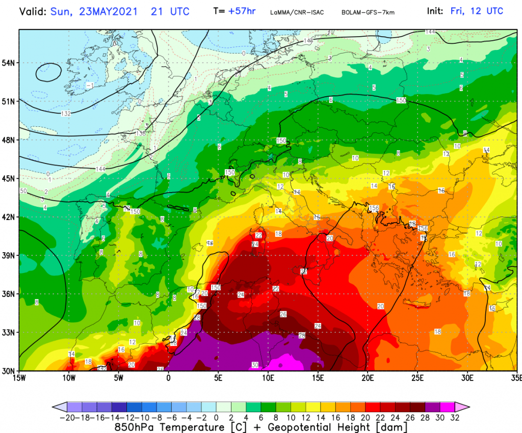 In particolare sull’entroterra e sulle piane interne della Sicilia, dove l’azione combinata fra prolungata insolazione e venti “favonici” potrebbe contribuire a far impennare le temperature su valori veramente elevati per il mese di maggio, tanto che in alcune località, fra l’entroterra catanese, siracusano, parte dell’ennese e sul nisseno, si potranno raggiungere punte di ben +35°C +36°C. Lunedì 24 maggio, invece, con la rotazione dei venti che si disporranno più da scirocco nei bassi strati, il caldo si avvertirà maggiormente sul palermitano, su parte della costa tirrenica messinese, e sulle aree più interne, fra agrigentino e parte nisseno, dove si potranno raggiungere valori superiori ai +32°C.