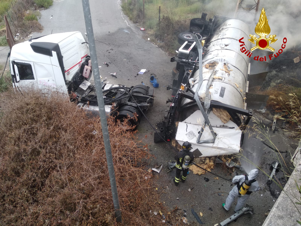 Un’autocisterna carica di acido nitrico è uscita di strada e si è incendiata, in salvo il conducente, unica persona a bordo del mezzo pesante: in corso l’intervento dei Vigili del fuoco nella zona industriale di Milazzo (ME). Nucleo NBCR (Nucleare Biologico Chimico Radiologico) al lavoro per la messa in sicurezza dell’area e del mezzo incidentato.