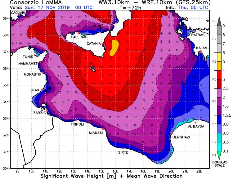 Il soffio dei venti da S-SE su un’ampia porzione di mar Ionio, con un “fetch” (spazio di mare su cui soffia il vento) esteso dal Golfo della Sirte fino alle coste calabresi, contribuirà ad agitare rapidamente tale bacino e lo Stretto di Messina lungo la sua imboccatura sud, favorendo lo sviluppo di onde alte sui 3 metri, anche oltre 4 metri sullo Ionio.