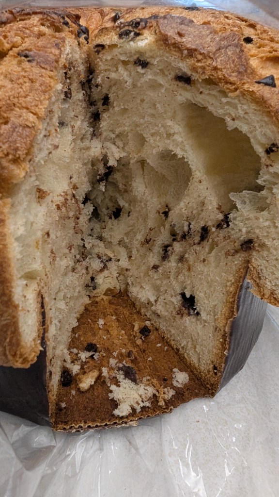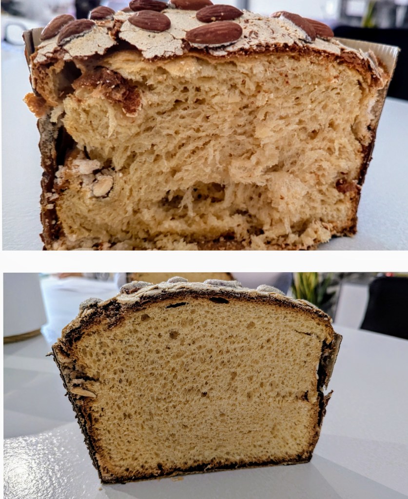 In alto panettone con lievito madre, in basso panettone con lievitino. Come si può notare cambia completamente la texture del prodotto.