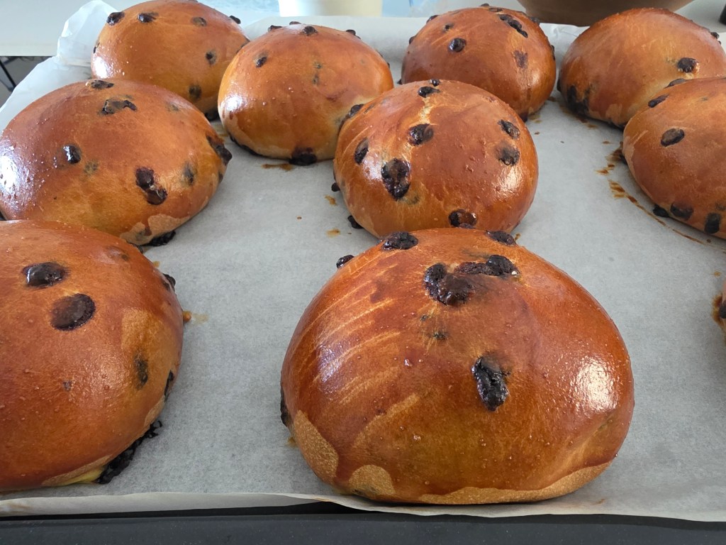 - Seconda lievitazione: Copri la teglia con un canovaccio pulito e lascia lievitare i pangoccioli per un’altra ora circa, o fino a quando non saranno visibilmente gonfi.