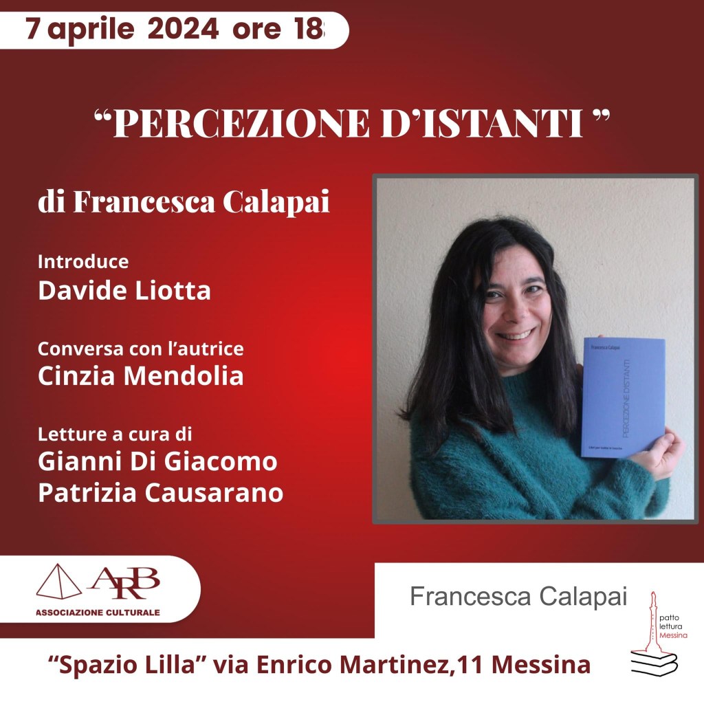 MESSINA – Francesca Calapai presenta “Percezione d’istanti”. La nuova raccolta poetica della poliedrica autrice messinese – arricchita dalle illustrazioni di Lelio Bonaccorso e Alessandro Oliveri – sarà presentata domenica 7 aprile, alle ore 18, a Spazio Lilla. Introduce Davide Liotta, conversa con l’autrice Cinzia Mendolia. Letture a cura di Gianni Di Giacomo e Patrizia Causarano.