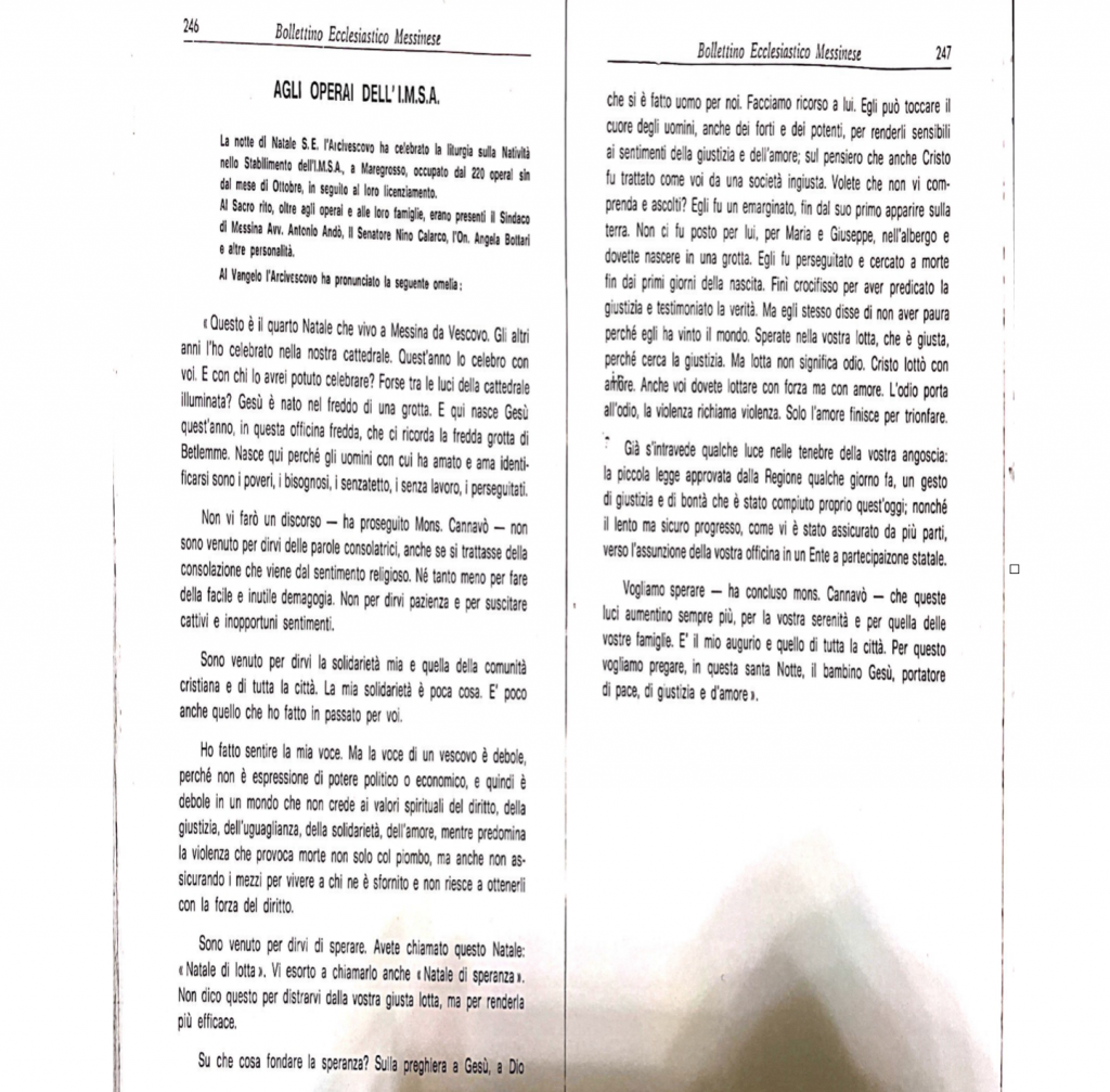 Quell’anno, in seguito al licenziamento di 220 operai dell’Industrie Meccaniche Società per Azioni di Maregrosso, i lavoratori occuparono la fabbrica. L’Arcivescovo, convinto da Giuseppe Pracanica, decise di dire la messa di Natale non in Cattedrale, ma in fabbrica. Un gesto forte testimoniato anche dal Bollettico Ecclesiastico Messinese dove è stata pubblicata l’omelia di monsignor Cannavò di quella notte.