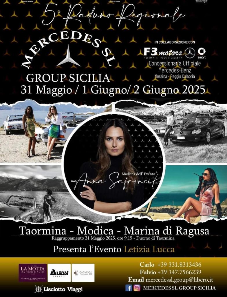 Tutto pronto per il quinto raduno delle Mercedes SL, le splendide vetture sportive di questa storica casa automobilistica, pronte per l’atteso appuntamento che come di consueto si svolgerà in Sicilia. Dopo le passate edizioni che hanno visto protagoniste decine di questi modelli, provenienti da tutta la Sicilia e in parte dal resto dello Stivale, insieme a madrine d’eccezione quali Maria Grazia Cucinotta, Anna Falchi, Sara Croce, sabato 31 maggio sfileranno in tutta la loro magnificenza a Taormina, l’1 giugno a Modica e il 2 a Marina di Ragusa. Madrina di questa edizione sarà Anna Safroncik, protagonista di numerosi film e volto storico della fiction Centovetrine. L’attrice sarà presente all’inaugurazione di sabato 31, a piazza Duomo a Taormina. Location che ha già ospitato queste auto in occasione del primo raduno.