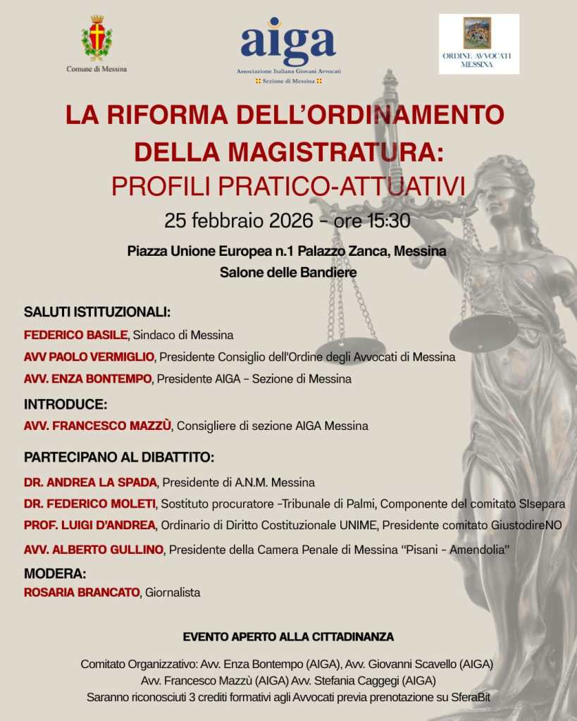 “La riforma dell’ordinamento della magistratura” è il tema del dibattito, organizzato dalla sezione messinese dell’Associazione italiana giovani avvocati, che si terrà mercoledì 25 febbraio nel Salone delle Bandiere di Palazzo Zanca con inizio alle 15.30. Mentre il dibattito pubblico si infiamma e la data del voto si avvicina, Aiga Messina ha scelto di accendere i riflettori sugli aspetti pratici della riforma de è intorno a questo tema che verrà articolato il confronto tra i relatori.