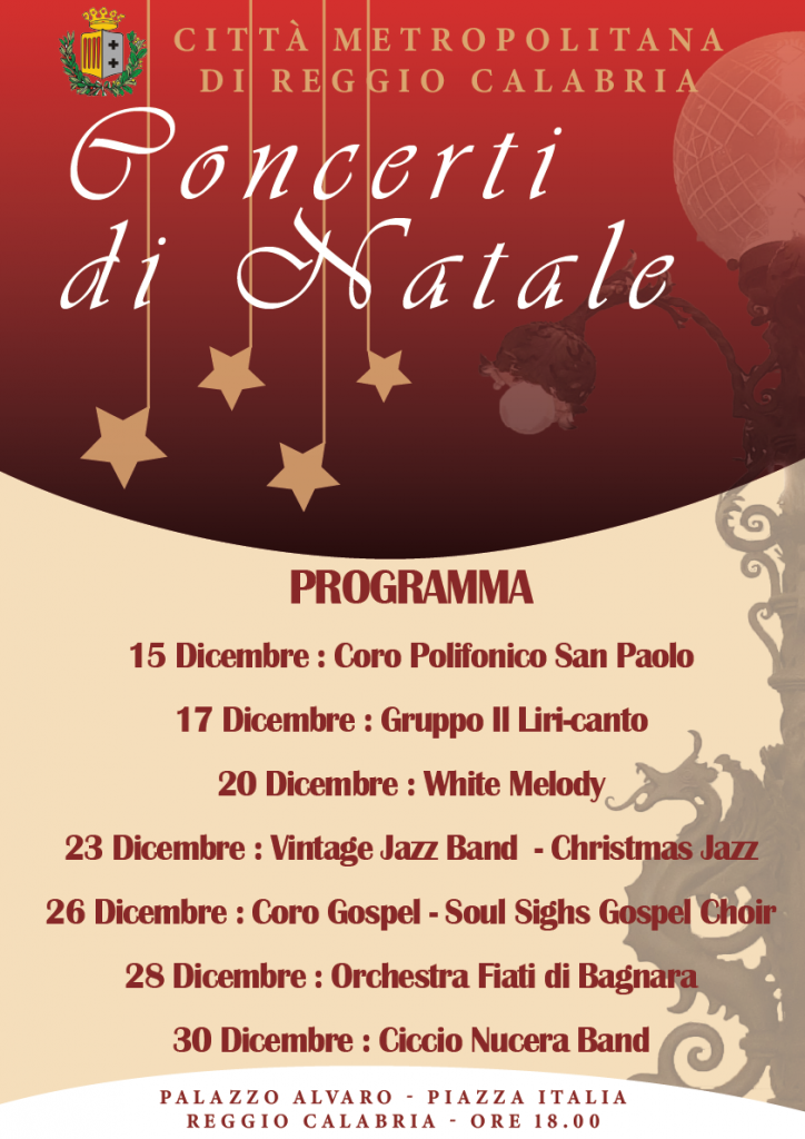 Reggio Calabria, 13 dic – Al via la rassegna “Concerti di Natale”, organizzata dalla Città Metropolitana di Reggio Calabria, che inizierà il 15 dicembre e ci accompagnerà sino alla fine del 2019.