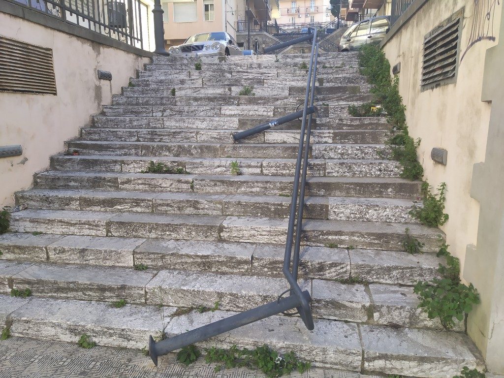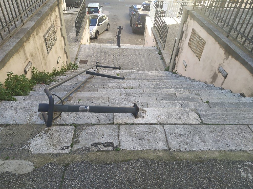 Reggio Calabria, 10 gennaio – Crollato il passamano in via Palamolla, dopo essere rimasto in “boloco” per diverso tempo. Qualche anno fa un auto si era schiantata contro il passamano delle scale che collegano via filippini a via Aschenez, danneggiandone gli attacchi a terra. In quella occasione però la struttura era rimasta in piedi grazie ad alcuni supporti rimasti integri. Il danno era stato non di poco conto, l’usura del tempo ha fatto la sua parte ed adesso c’è stato il crollo del passamano, che infatti è rimasto lì a terra, senza porte più avere la sua funzione anzi creando intralcio ai pedoni.