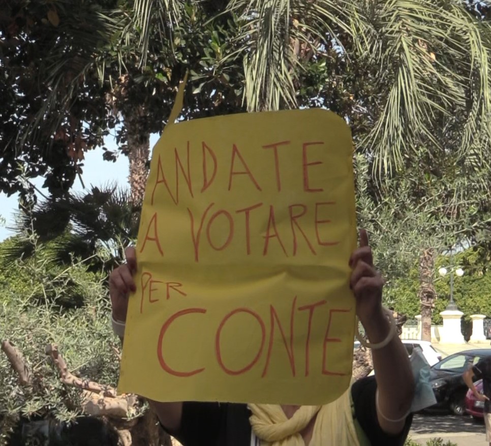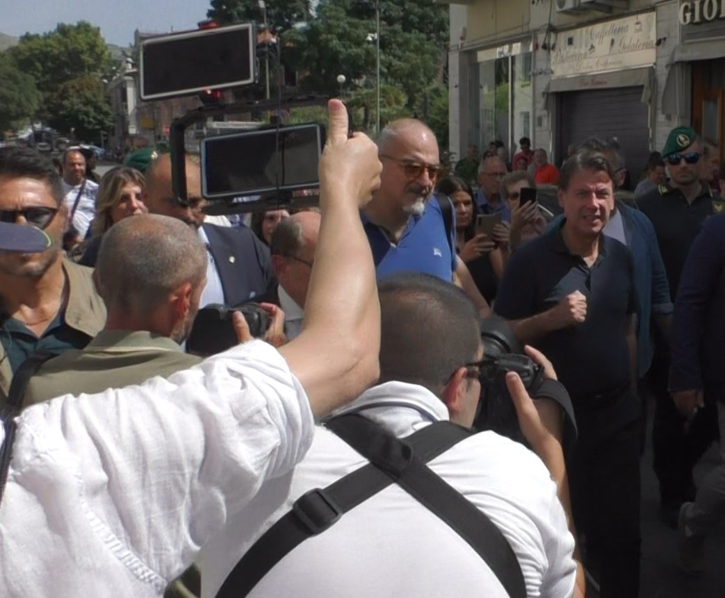 A seguire, ecco il “punto-stampa” che repentinamente si trasforma in un’arringa-lampo da un palchetto, coi cronisti schiacciati e impossibilitati a parlare. Per la scarsa voglia di rispondere di Conte; per il suo pochissimo tempo disponibile, visto il ritorno quasi immediato in Sicilia; ma anche per le mille gomitate subite.