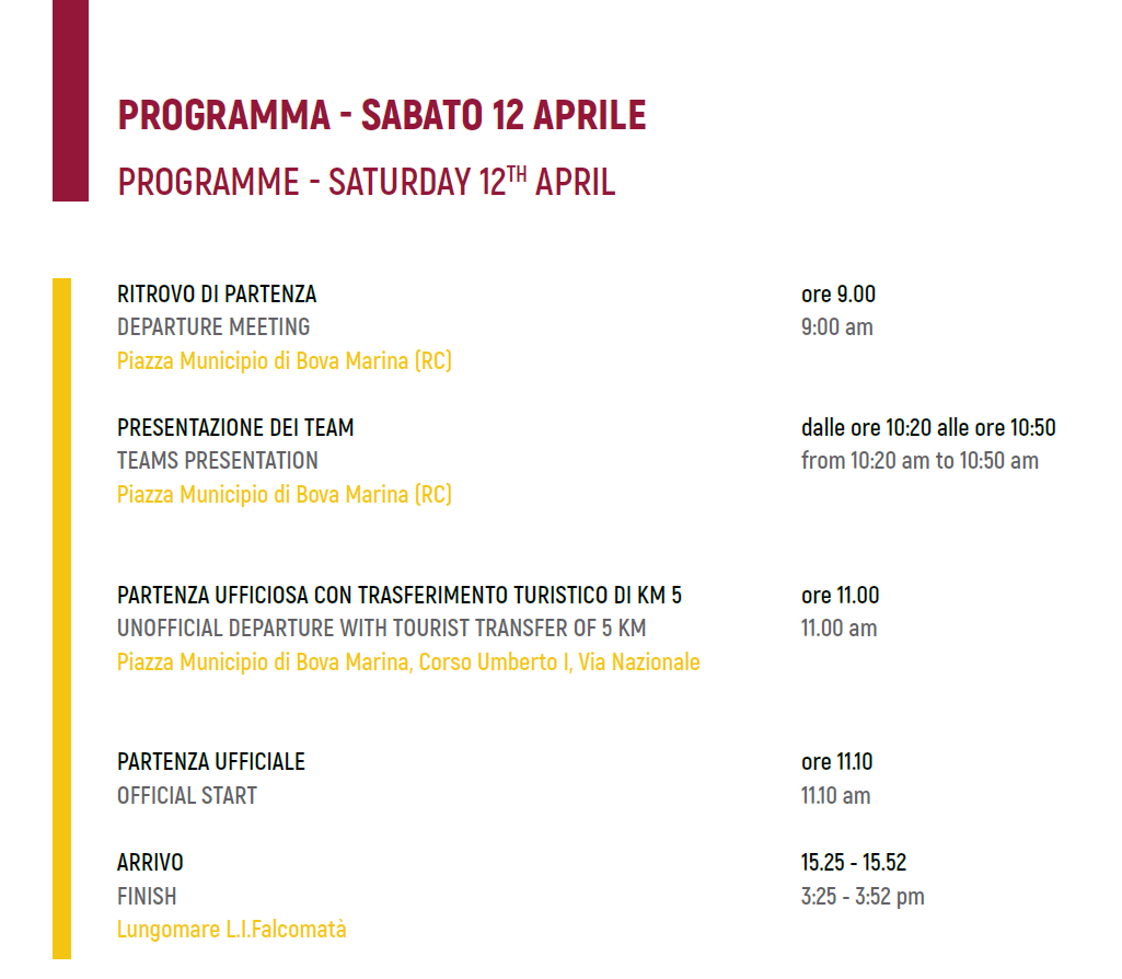 A Bova Marina le formazioni si alterneranno sul palco di Piazza Municipio dalle 10.20 alle 10.50, prima dell’incolonnamento e del via alle ore 11. L’arrivo sul Lungomare Falcomatà a Reggio Calabria è previsto tra le 15.25 e le 15.50.