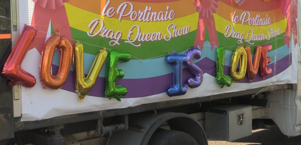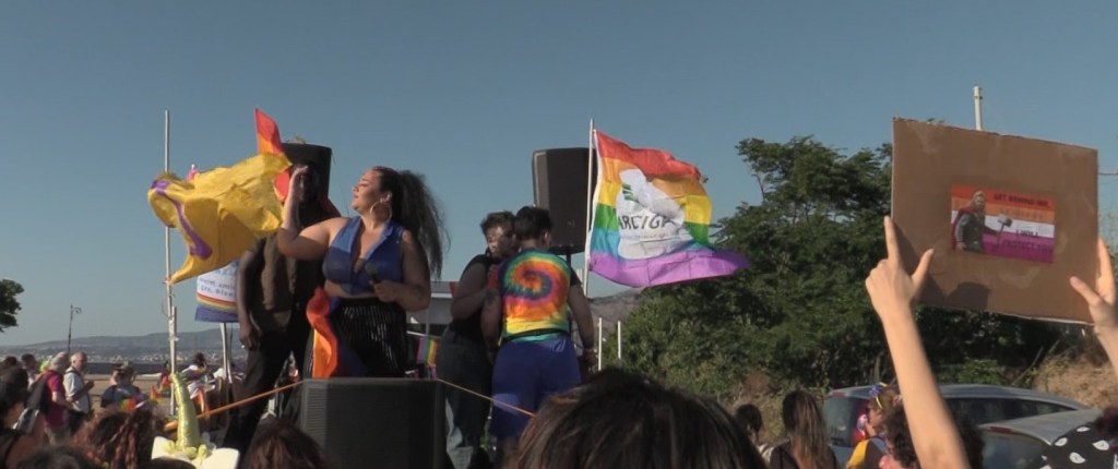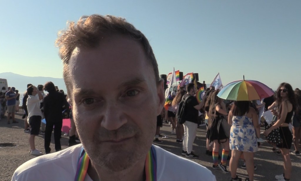 Mare azzurrissimo, barca a vela all’orizzonte… ed ecco che, anche davanti a telecamere e microfoni, parte pure qualche piccola effusione: il popolo del Pride si sa com’è, vuol essere se stesso anche in termini di trasgressività, a volte forse un po’ ostentata. Ma è un giorno di festa, ci sta.