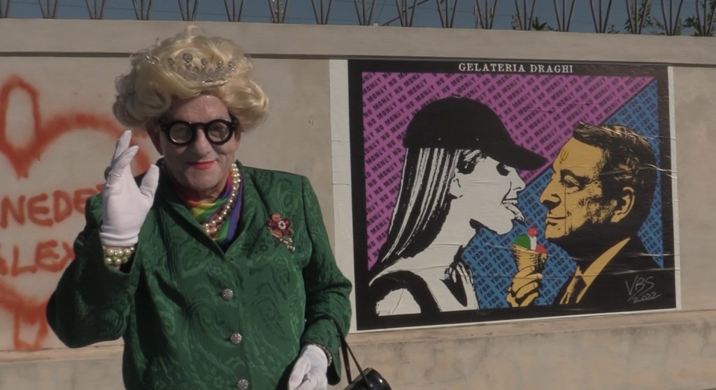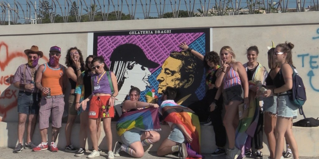 Tra i venditori di magliette e d’acqua e di pizza al taglio, spuntano vessilli dell’Orgoglio bisessuale, ragazzoni ingabbiati in enormi drappi arcobaleno, scritte che inneggiano ai «Frocә di provincia unitә alla lotta transfemminista».