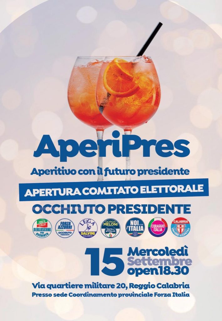 Per essere più precisi, oggi pomeriggio a Reggio Calabria si terrà un AperiPres, o Aperitivo con il futuro Presidente, come viene un po’ goliardicamente identificato l’appuntamento inaugurale per il Comitato elettorale “Occhiuto Presidente” su scala metropolitana a Reggio Calabria in via Quartiere Militare.
