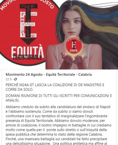 Dal canto suo, il sindaco di Napoli e aspirante Governatore calabrese rileva che «dopo mesi di percorso comune», sono «i vertici» di Equità territoriale ad aver gettato la spugna. E «nonostante il pensiero contrario della maggioranza», avrebbero abbandonato lo schieramento comune «con pretesti e argomenti privi di fondamento».
