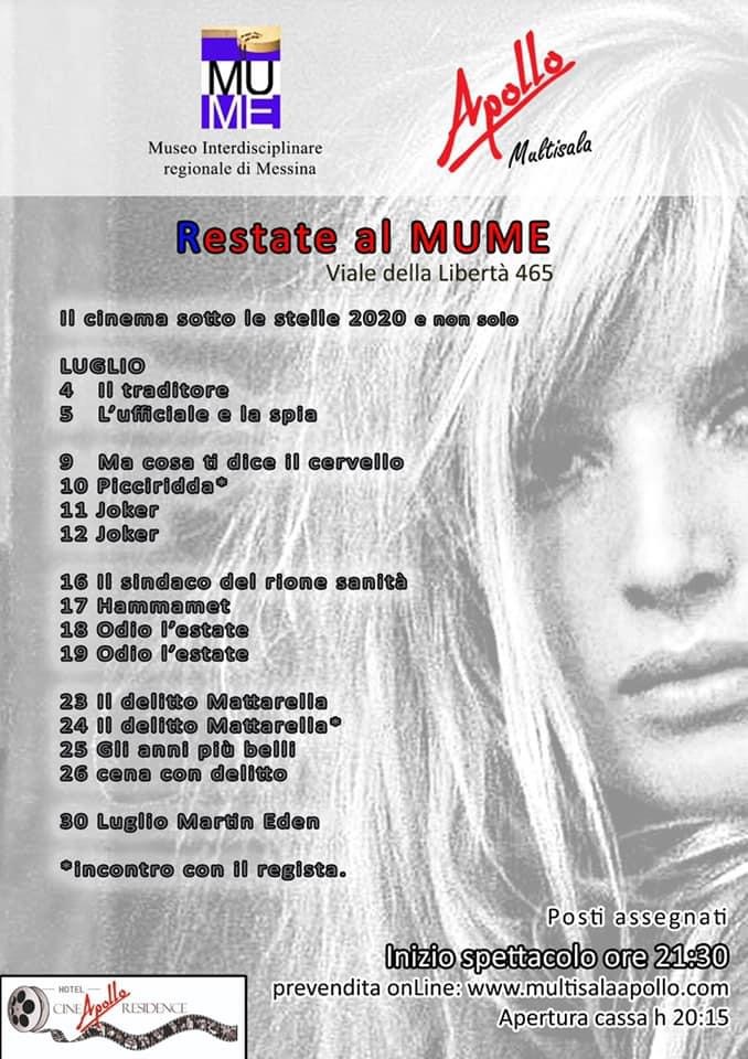 La rassegna cinematografica sarà presentata in conferenza stampa, al Residence Cine-Apollo di Messina in via S. Filippo Bianchi n. 23, giovedì 2 luglio, dalle ore 10.00. Interverranno Loredana Polizzi e Fabrizio La Scala (Multisala Apollo), il direttore del MuMe – Museo Interdisciplinare Regionale di Messina, Orazio Micali, e Francesco Torre, consulente per la progettazione culturale strategica.
