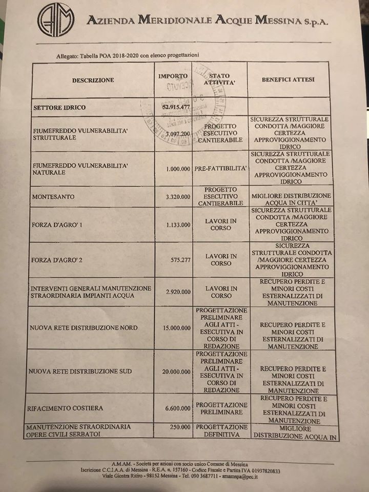 Nel piano, per il settore idrico, interventi da 53 milioni, di cui quasi 5 già impegnati per lavori in corso (1,7 milioni a Forza d’Agrò e quasi 3 milioni per manutenzione straordinaria impianti che consentirà recupero perdite e minori costi). Sono poi esecutivi e cantierabili i due progetti, per un totale di oltre 6 milioni, per la vulnerabilità strutturale dell’acquedotto Fiumefreddo e per il recupero del serbatoio Montesanto.