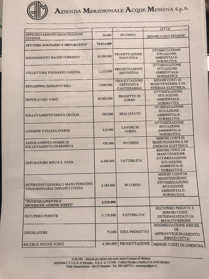 L’Amam ha già conferito gli incarichi ai propri uffici per le progettazioni esecutive per la sostituzione di tutte le reti di distribuzione e per l’adeguamento di tutti gli impianti di depurazione.