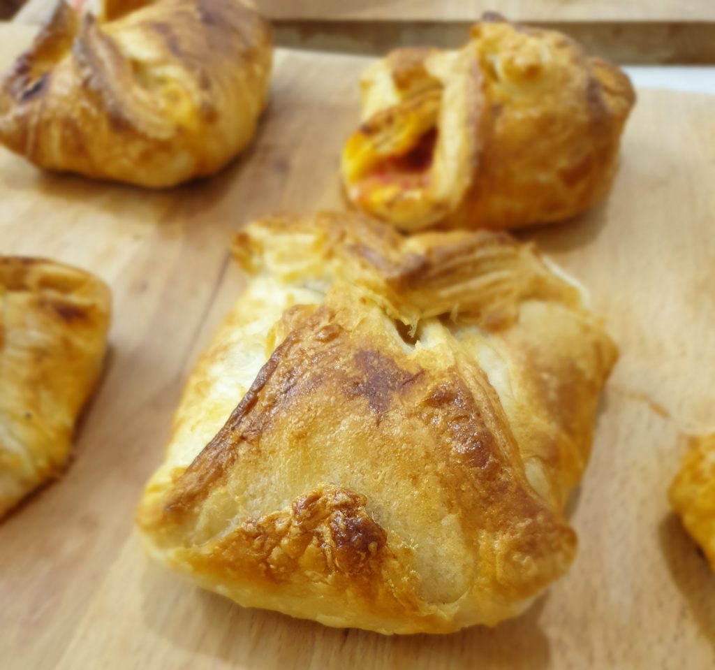 Stendiamo, con un mattarello, uno strato alto 0,3-0,4 cm non meno. Con un coltello creiamo quadrati di pasta sfoglia con un lato di 10 cm circa. Possiamo sbirrazzirci con il ripieno usando la nostra fantasia. Io li ho riempiti di proscitto, formaggio e besciamella. Li ho piegati a triangolo ed a saccottino. Vedi foto.