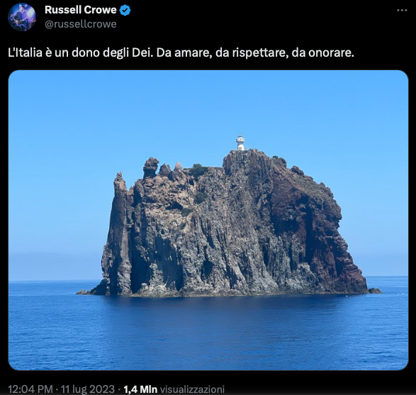 Russel Crowe conquistato dall’Italia e dalla Sicilia in particolare. Dopo l’avvistamento a Catania dei giorni scorsi, l’attore neozelandese sta trascorrendo le vacanze in yacht tra le Isole Eolie, Taormina e la costa orientale. Le “tracce” dei suoi spostamenti sono rinvenibili, come spesso accade di questi tempi, sui social. Ieri pomeriggio, su Facebook, è comparsa la foto dell’attore con un noto ristoratore di Taormina istantanea che testimonia il suo passaggio nella Perla dello Jonio, dove Crowe è già stato in passato per il Taormina Film Fest. Direttamente sul suo profilo Twitter, martedì, è stato invece pubblicato un inequivocabile messaggio d’amore per l’Italia e le sue meraviglie. Il tweet, con una foto dell’isola di Strombolicchio, è accompagnato dalla dedica: “L’Italia è un dono degli Dei. Da amare, da rispettare, da onorare”. Un “cinguettio” da 1,4 milioni di visualizzazioni.