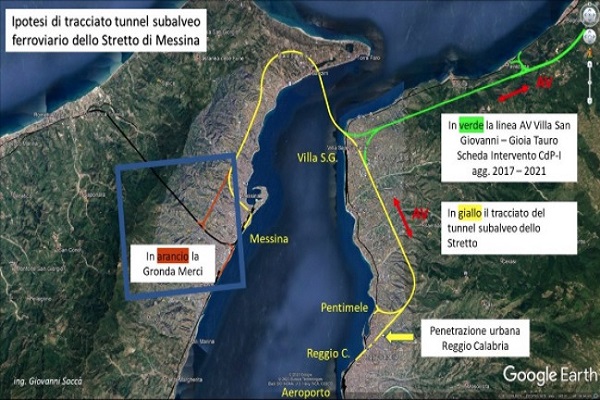 Saccà, ingegnere di origine messinese che ha lavorato per 32 anni nelle Ferrovie dello Stato e ora vive in Veneto, spiega così l’idea del tunnel. “In una zona precisa dello Stretto tra Villa San Giovanni e la contrada Arcieri di Messina (nella frazione di Sant’Agata), il mare non è molto profondo a causa della ‘Sella dello Stretto’. Alla profondità di soli 170 metri questa fascia continua di terreno è larga più di 2 km e può consentire, con copertura maggiore di 50 metri di terreno, la costruzione di tunnel subalvei con la Tbm (Tunnel Boring Machine), come ha evidenziato la Società ‘Stretto di Messina’ nel libro ‘The Messina Strait Bridge’, Edizioni Crc Press 2010. Questa continuità geologica, oltre alle gallerie, permette anche di costruire ponti a più campate, utilizzando tecniche già sperimentate per realizzare strutture offshore, posando piloni Gbs (Gravity-Based Structure) e inserendoli su un terreno che qui si trova solo a circa 100 metri sotto il livello del mare. Tutti i problemi, compresi quelli derivanti dalle faglie, sono tecnicamente già stati risolti con successo in tanti analoghi tunnel subalvei realizzati, come in quello della Manica e in altri in Turchia e Giappone. Considerando che il progetto AV/AC da Gioia Tauro AV a Villa San Giovanni già prevede una galleria ferroviaria a doppia canna lunga circa 34 km, per attraversare lo Stretto in galleria e trovarsi in Sicilia, basterebbe prolungare tale galleria solo di poco più di 4 km. In Sicilia, la stessa galleria deve poi risalire per 17 km per connettersi con le linee ferroviarie per Catania e Palermo, così come era previsto per il Ponte sullo Stretto”.