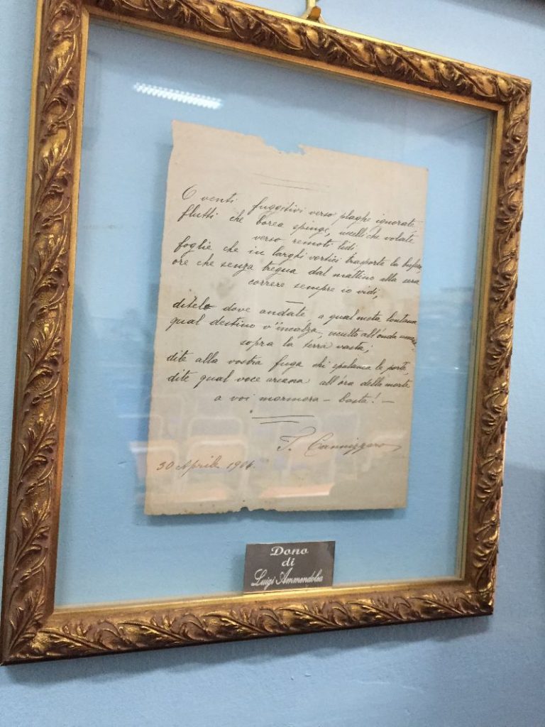 Vive per quasi dieci anni nella villa ubicata tra Messina e Taormina, continuando a coltivare l’ars poetica, ma dedicandosi anche appassionatamente alla collezione di minerali e di fossili, alla ricerca e alla divulgazione delle tradizioni popolari messinesi, allo studio delle scienze naturali e della filosofia. Amore sconfinato per il sapere, il suo, che lo porterà col tempo a formare una ricchissima biblioteca. Più tardi sposerà Maria Kubli, diventando padre di sei figlie e di un figlio, che gli premorrà. In questo periodo si stabilisce definitivamente a Messina, dove acquista una tipografia, trasferita poi nella sua abitazione, che trasformerà nella sua personale fucina di capolavori. Fino al 1908, quando immediatamente dopo il cataclisma fatale si trasferirà a Catania, pubblica raccolte foltissime di liriche italiane e francesi, quali In solitudine, Carmina, Foglie morte, Epines et roses, Cianfrusaglie, Tramonti, Uragani, Cinis e Quies. Nel 1900 è la volta di Vox rerum, alla cui preparazione si alternarono le numerose raccolte di traduzioni da diversi poeti e prosatori europei. L’opera più interessante di questo periodo è però una traduzione in dialetto messinese della Divina Commedia del 1904, una vera chicca. Ma il 1904 è anche l’anno in cui scrive la nostra poesia. Ma come è saltato fuori il prezioso documento? Custodito per anni con estrema cura da un antiquario d’eccezione, il dottor Luigi Fortunato Ammendolea, adesso il prezioso documento campeggia glorioso nell’aula magna dell’Istituto Comprensivo “Cannizzaro – Galatti”, “lì dove è giusto che sia, fruibile a tutti e a disposizione della collettività”, come afferma il noto antiquario che, con particolare e onorevole sensibilità, ha donato il manoscritto alla scuola.