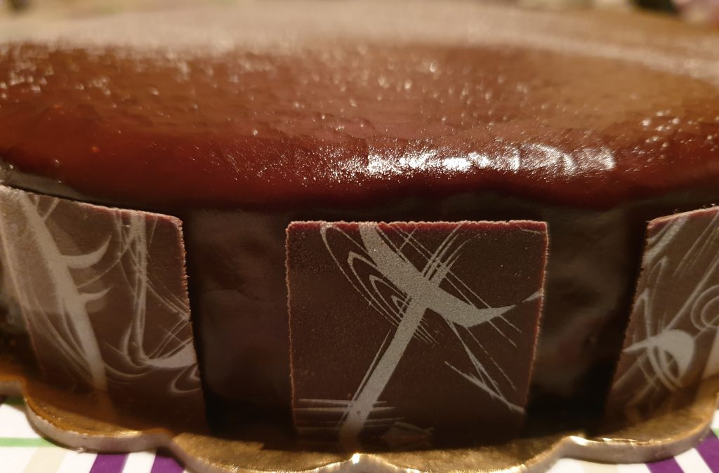 Ingredienti Glassa a specchio: 275 gr di acqua, 210 gr di panna, 125 gr di sciroppo di glucosio, 125 gr di zucchero, 125 gr di cacao in polvere, 8 gr di gelatina in fogli.