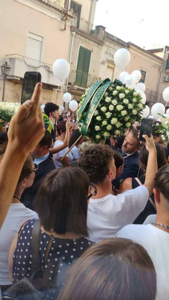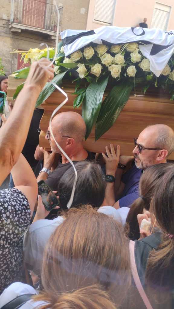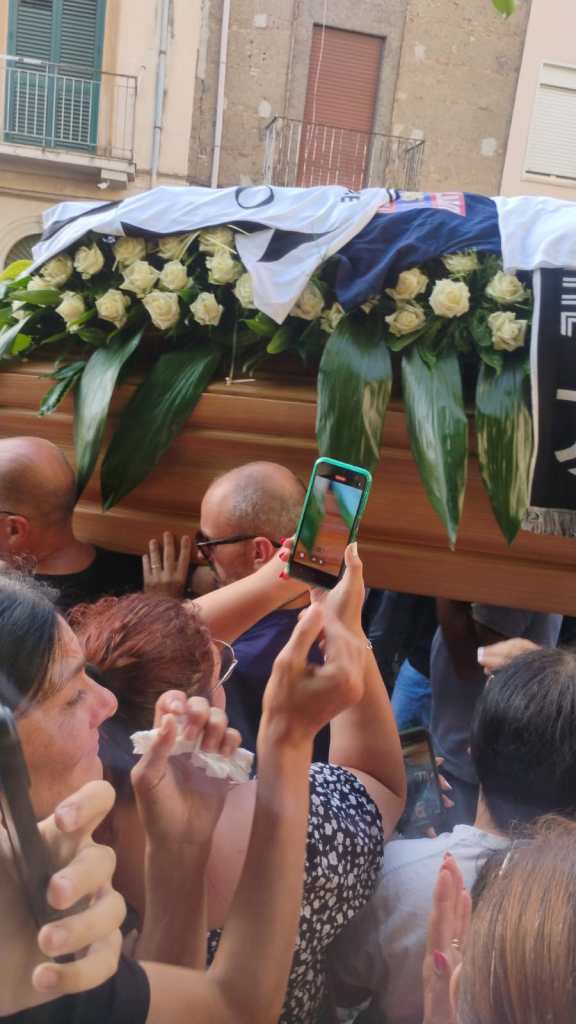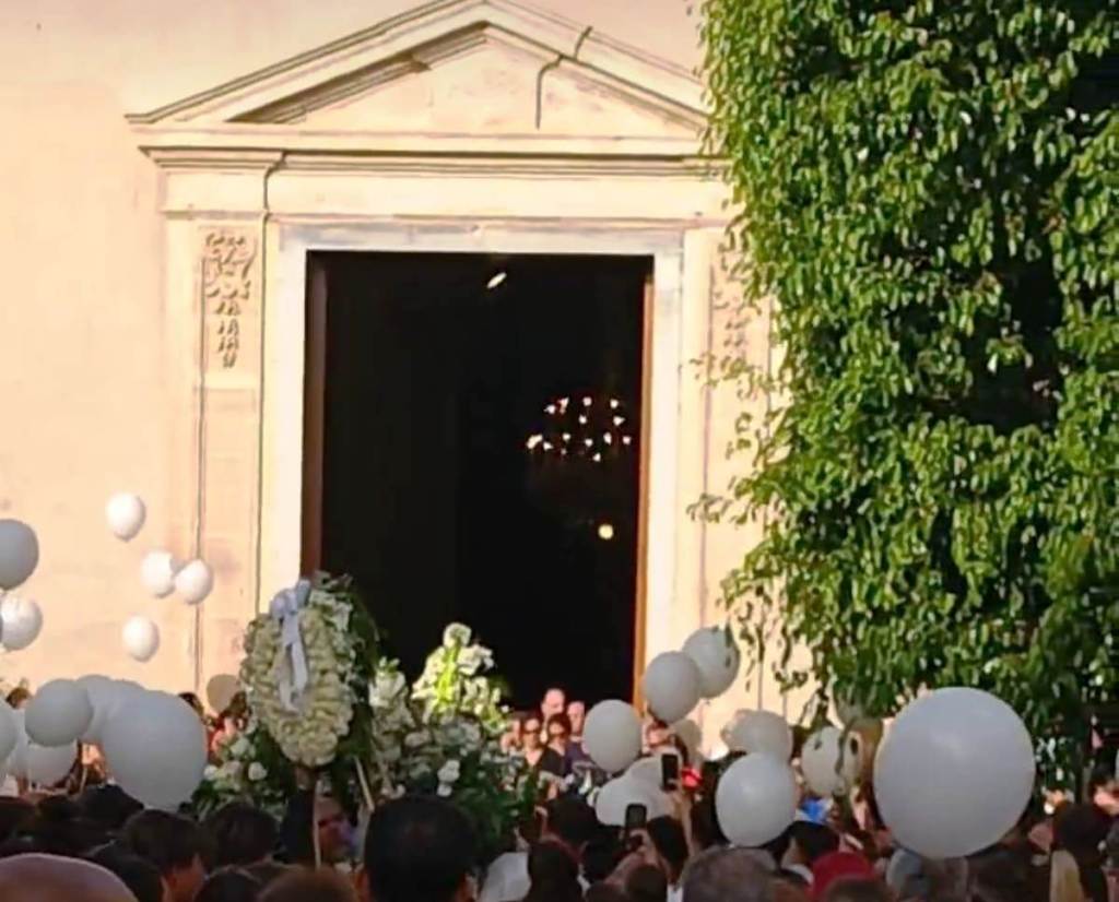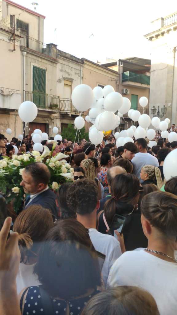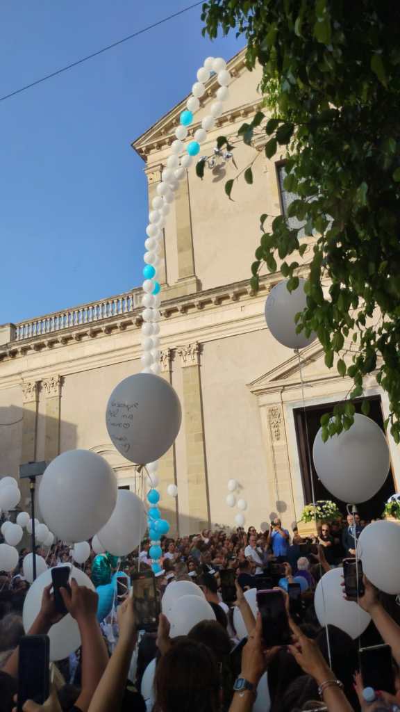 “Ciao Simone il tuo banco sarà per sempre riempito dal tuo ricordo”, recitava uno dei tanti striscioni con cui i ragazzi hanno accolto i due feretri all’ingresso in chiesa e li hanno accompagnati all’uscita, quando 5 lunghissimi minuti di campana hanno preceduto gli applausi scroscianti ed il liberarsi in aria di decine palloncini bianchi e un “bracciale” di palloncini bianchi con una croce di palloncini azzurri, come quelli che indossavano i ragazzi e che qualcuno degli amici ha adagiato anche sul “muro del pianto” in via Kennedy, dove è avvenuto l’incidente mortale.