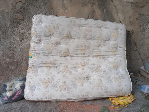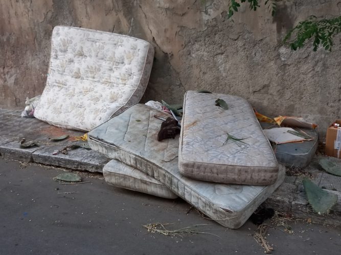 Via Enotria, a Santa Caterina: tra quantitativi industriali di materassi, sacchetti d'immondizia a go-go, mobiletti e scarpe, una situazione imbarazzante
