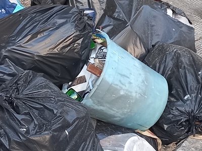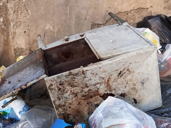 In atto, il reperitore-di-cianfrusaglie eventualmente di passaggio potrà trovare un quantitativo industriale di materassi – anche matrimoniali -, scarpe (pure spaiate). Sacchetti di scarti a sfondarsi, mobiletti in legno verniciati. Secchi pieni di robaccia, cartoni ancora più stipati. E poi mobiletti metallici a doppia anta e spazzatura, spazzatura, spazzatura.