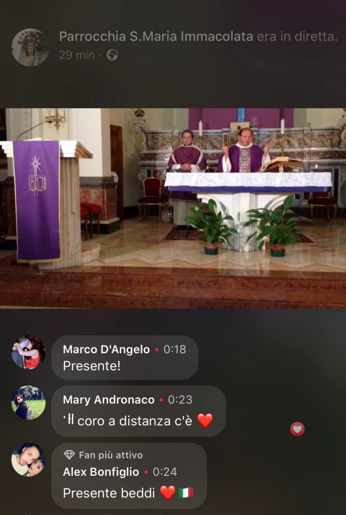 Per continuare a stare vicini, i fedeli possono partecipare, in diretta Facebook, tutti i giorni, alla Santa Messa, al Rosario, alla Via Crucis il venerdì e all’adorazione eucaristica il martedì.