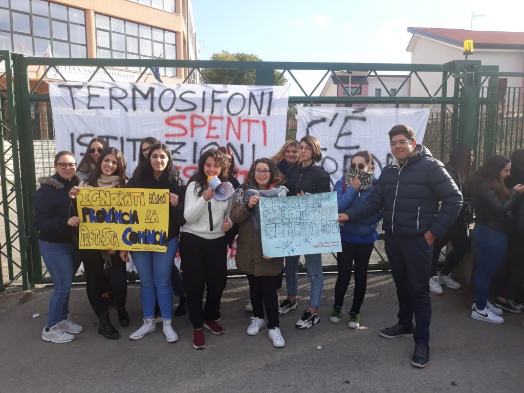 Nella sede centrale di Trappitello (Taormina) la caldaia non funziona ed in metà delle aule del plesso i termosifoni sono rimasti spenti. Nell’altra metà vi sono i condizionatori e pertanto il riscaldamento è garantito. Ma la quasi totalità degli allievi ha deciso di scioperare in attesa che l’impianto venga ripristinato. Il dirigente scolastico, il professore Luigi Napoli, si è già attivato per risolvere il disagio ed ha parlato direttamente con i rappresentanti d’Istituto.