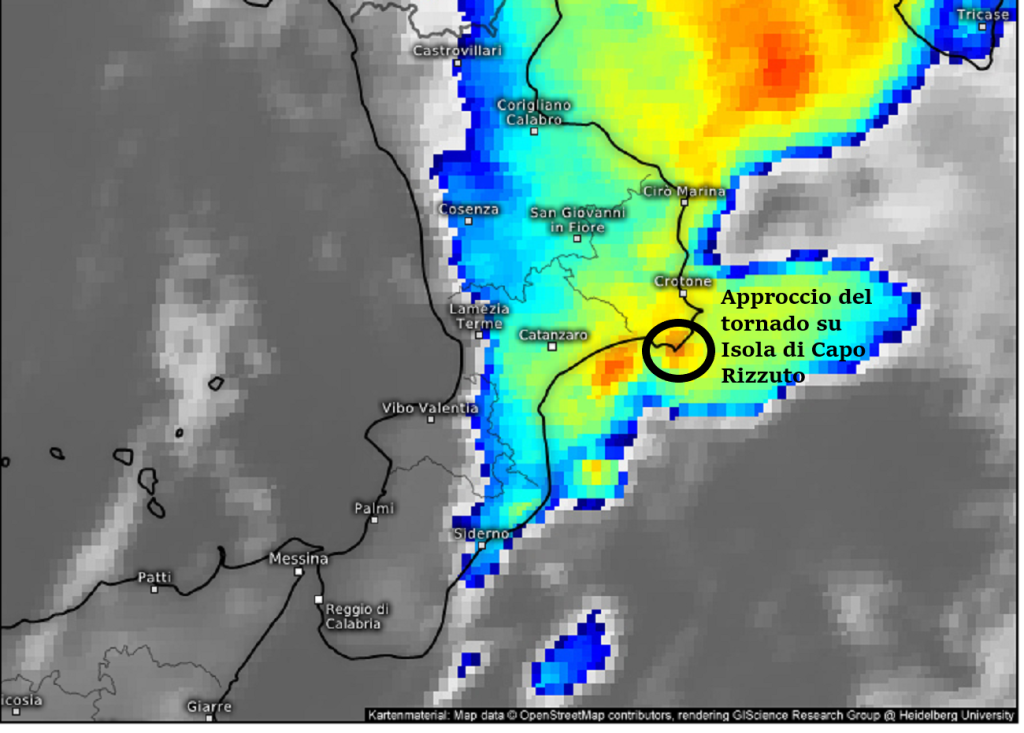 Intorno le 04:00 del mattino di domenica la “supercella” è stata agganciata dalla “v-shaped storm” che l’ha spinge in direzione della costa di Isola di Capo Rizzuto. Durante l’approccio sulla terra ferma la “supercella” mantiene la sua forza, con una circoscritta circolazione “mesociclonica” generatrice del fenomeno tornadico.