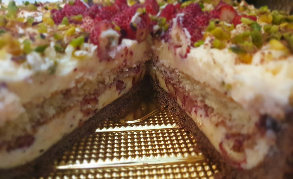 Cosa ci serve: Pasta frolla al cacao, pan di spagna, crema diplomatica, fragoline di stagione, granella di pistacchi, teglia a cerniera da 24 cm.
