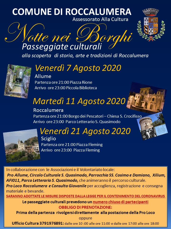 ROCCALUMERA – Tre notti nei borghi roccalumeresi. Gli eventi sono organizzati dall’assessorato alla Cultura, diretto da Natia Basile, assieme alle associazioni locali. Si tratta di passeggiate culturali alla scoperta di storia, arte e tradizioni di Roccalumera che avranno luogo il 7, l’11 e il 21 agosto. La prima passeggiata sarà al borgo di Allume (partenza alle 21 in piazza Rione e arrivo alle 23 alla piccola biblioteca); la seconda sarà fatta a Roccalumera centro e partirà dalla chiesa del Crocifisso e si concluderà al Parco Quasimodo dopo la visita alla torre Saracena; protagonista della terza e ultima passeggiata sarà invece la frazione di Sciglio: si percorrerà la strada di San Cosimo e Damiano e durante il percorso ci saranno tanti angoli e luoghi da scoprire.