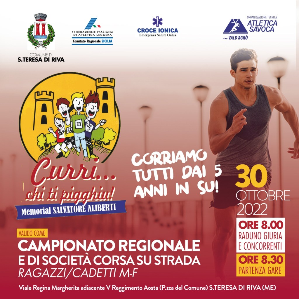 SANTA TERESA DI RIVA – Ultimi preparativi in vista dell’11ª edizione del “Trofeo Curri chi ti pigghiu – Memorial Salvatore Aliberti”, in programma domenica 30 ottobre nella ridente Santa Teresa di Riva. La manifestazione sportiva, organizzata e promossa dall’Atletica Savoca della presidente Manuela Trimarchi con il patrocinio del Comune di Santa Teresa di Riva, è valida come Campionato Regionale Individuale e Promozionale (Ragazzi/e e Cadetti/e) di corsa su strada.