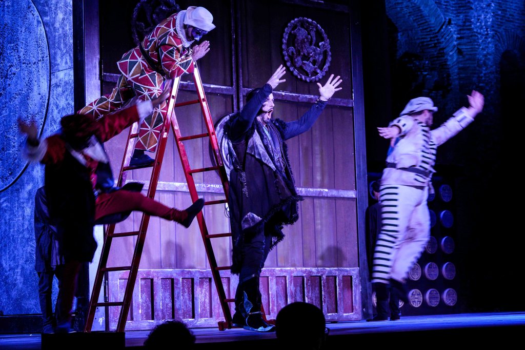 Il regista ha scelto invece tre costumi della commedia dell’arte – Pantalone, Arlecchino, Brighella – per i tre ministri del regno Ping, Pong e Pang, a voler significare il lato più ironico, o forse grottesco, di una vicenda altrimenti densa di tensione e sinistra. Anche nella Turandot di Ferruccio Busoni i ministri (due) hanno nomi attinti dalla commedia dell’arte, Tartaglia e Pantalone. Tuttavia, pur rispettando la scelta, a mio modesto avviso, i costumi dei tre personaggi sono apparsi troppo avulsi dal contesto, quando forse sarebbe stato più efficace scegliere una ulteriore gradazione di colori per i tre bravissimi interpreti.
