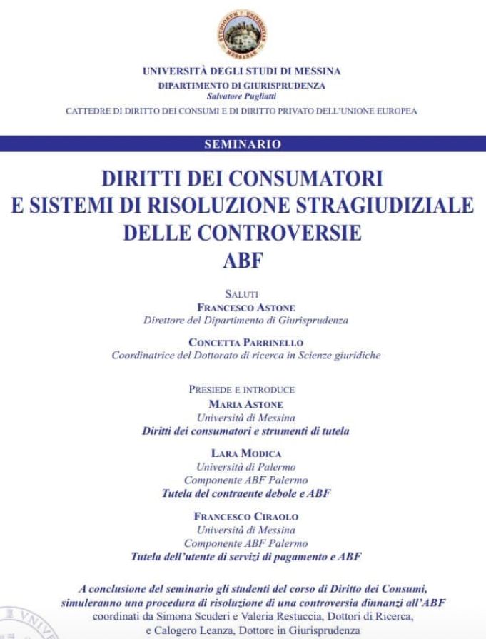 “La scienza giuridica non è una scienza astratta, ma una scienza pratica” diceva Salvatore Pugliatti. Ciò che il Sommo Maestro della scuola del diritto messinese affermava a proposito delle categorie giuridiche nell’ambito della ricerca dell’ “interesse” non può di certo limitarsi alla forma di un mero assunto didattico. Deve, di contro, trovare uno spunto di applicazione pratica nella realtà di tutti i giorni. L’occasione è stata fornita proprio da un convegno universitario che ha previsto anche un momento in cui i protagonisti sono stati gli stessi studenti. Nell’aula 4 del Dipartimento di Giurisprudenza infatti, si è svolto oggi il seminario di studi intitolato “Diritti dei consumatori e sistemi di risoluzione stragiudiziale delle controversie ABF”.