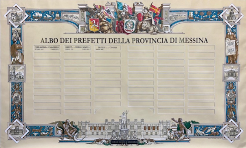 La progettazione di un nuovo albo dei Prefetti ha la finalità di dare degna prosecuzione al più antico ormai completo. Questa pergamena servirà a elencare i nomi dei vari Prefetti che, nel corso degli anni, si avvicenderanno nella Prefettura di Messina. In questa occasione, il giovane artista Mario Valenti si è cimentato a sintetizzare parte della grande storia della città di Messina, nelle varie iconografie e simbologie, nella ricca cornice interamente disegnata a mano su carta pergamenata.